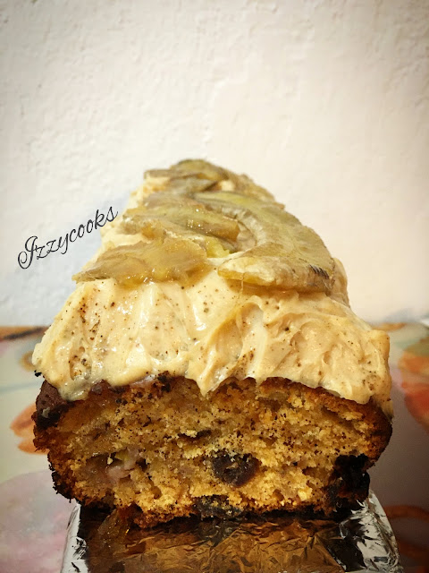 За сглобяването изваждаме кекса от формата и го прехвърляме в чиния. Намазваме обилно с глазурата и отгоре подреждаме карамелизираните банани.